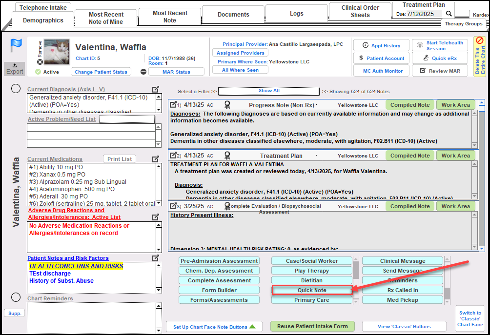 From the patient's chart face, the Clinical Note Without Encounter note now displays as Quick Note.