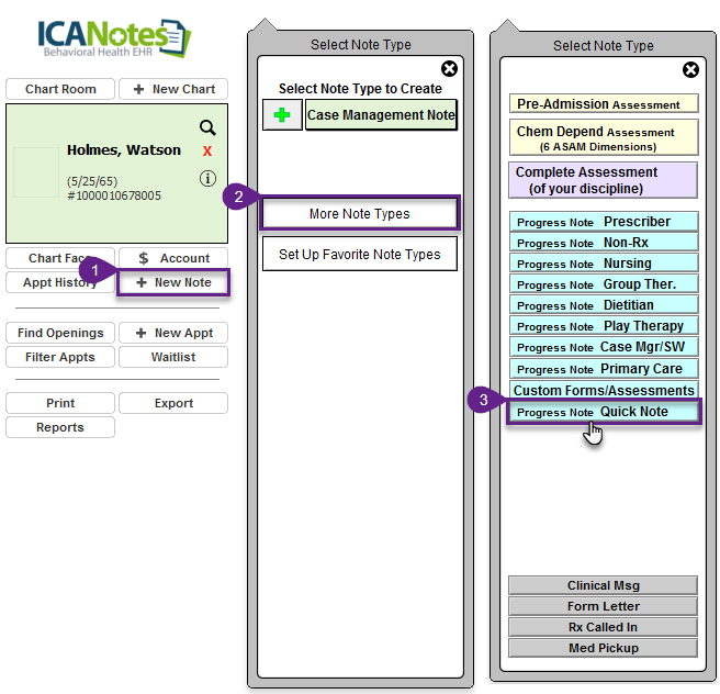 ICANotes users utilizing the New Calendar will have quick access to the note by clicking New Note > More Note Types then selecting the Quick Note.