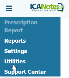 1. Click the2. After the app has downloaded to your phone, access DrFirst within ICANotes from any access point (Chart Room, Demographics, prescribing progress note). From the Settings menu at the top left, go to Utilities