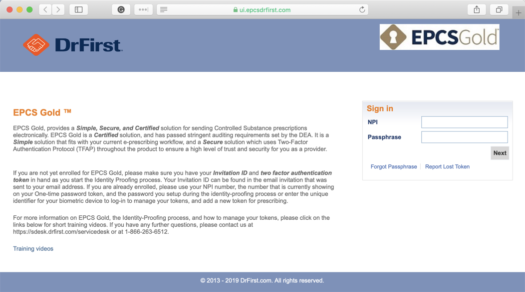 3. You will then be prompted to log in to your EPCS account. Simply enter your NPI and signing passphrase. Then click Next.