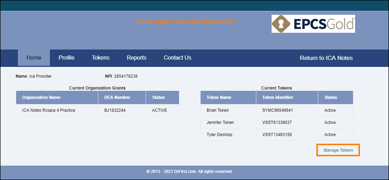 4. Next, you will see a screen displaying your name, NPI, and current active tokens to the right. To add a new token, click the "Manage Devices" link.