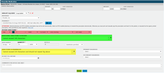 Any prescription that has excessive characters (greater than 210 characters for Directions to Pharmacist or greater than 140 characters for Directions to Patient) will trigger an automatic fax transmission.