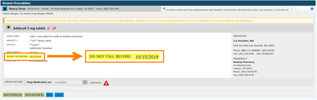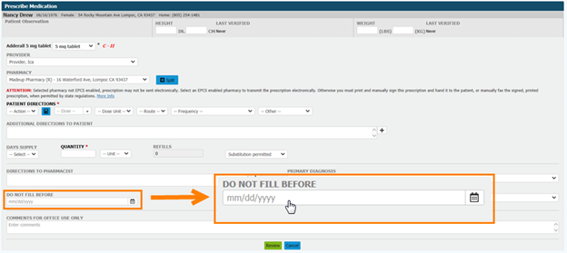 When e-prescribing a controlled substance in DrFirst, you have the option to set a Do Not Fill (DNF) until date. To send the prescription to the pharmacy with a DNF date, use the "Do Not Fill Before" field to specify the date accordingly: