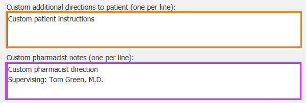 In the Prescription section, locate the text boxes for “Custom additional directions to patient (one per line)” and “Custom pharmacist notes (one per line)”