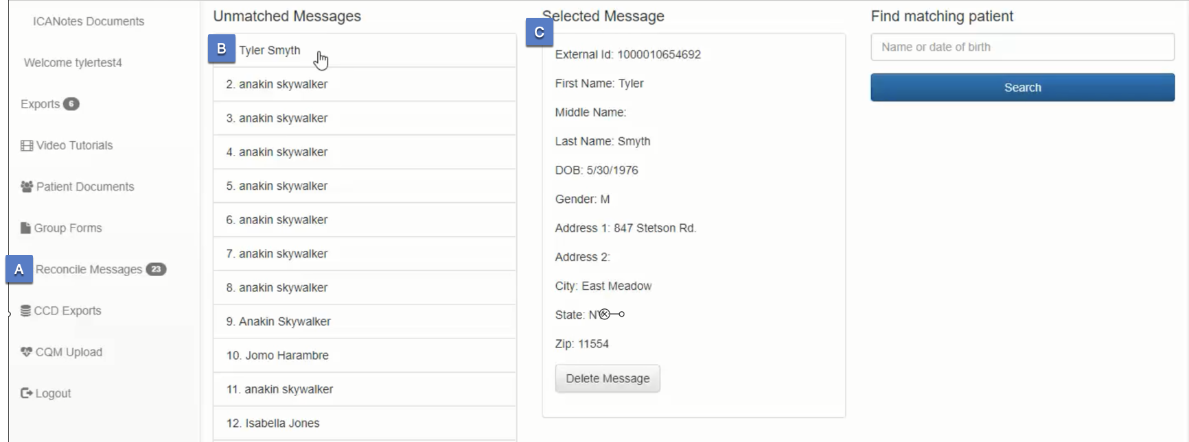 2. On the Upload site, (A) click on Reconcile Messages and you will see a list of unmatched patients.