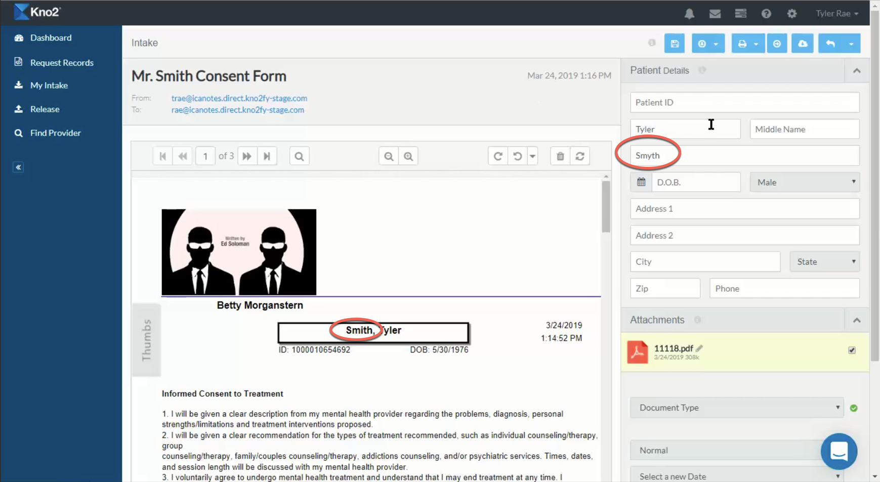 1. In Kno2, this patient is being sent a document that has an incorrect spelling of his last name. Because the last name is spelled differently than the patient we have in ICANotes, this document will not auto-assign to the correct patient but will go to the Reconcile Messages tab.