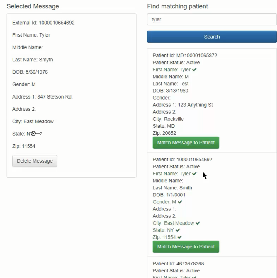 4. The Upload Site will search for any patients that have tyler in the name and will give a checkmark for any matching criteria in the Selected Message.