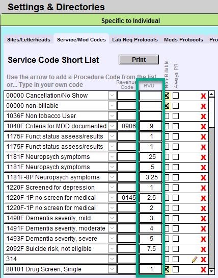 - The provider's name will be listed on the left, then each service code with an associated RVU code will be itemized.