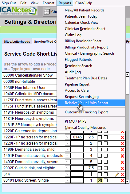 ICANotes offers a workflow for setting Relative Value Units for service codes, then tracking of those units used in the Relative Value Units report, visible to users with RVU Admin access enabled from the Security Center.