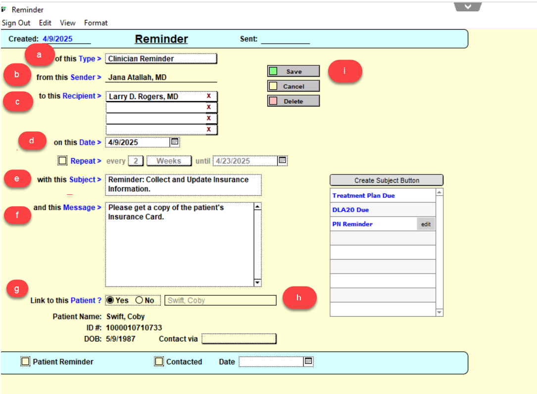 - Click the Save button to create the Reminder.