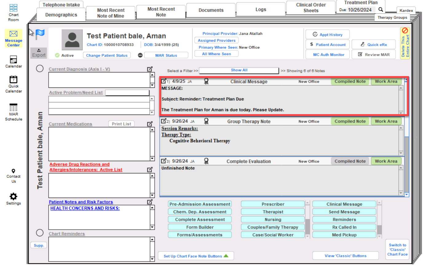 7. The Clinical Message will be seen on the Chart Face.