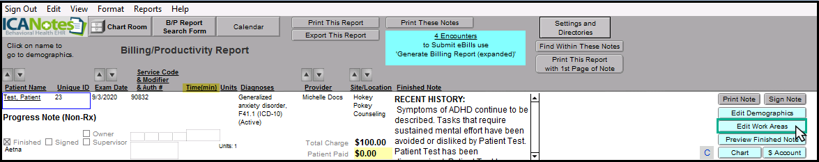 For one of the sessions, the clinician did not enter the Start and End times. This can be updated using the Edit Work Area button. Only the Note Owner or the Supervisor of the Note Owner will be able to access the Work Areas to make changes.