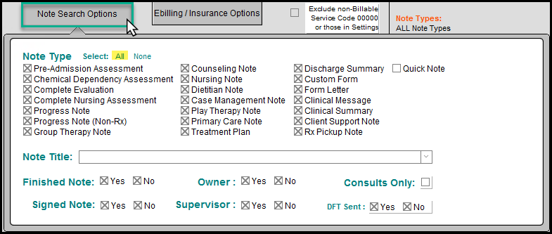 Select the note types you would like included in your report. This can be done by manually checking boxes for note types to include. For the purpose of this guide, All note types are being used. You can click on None to de-select all not options.