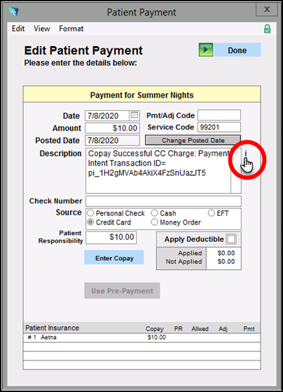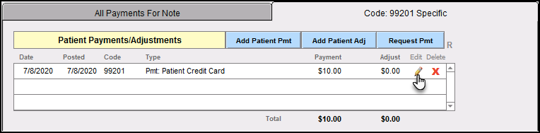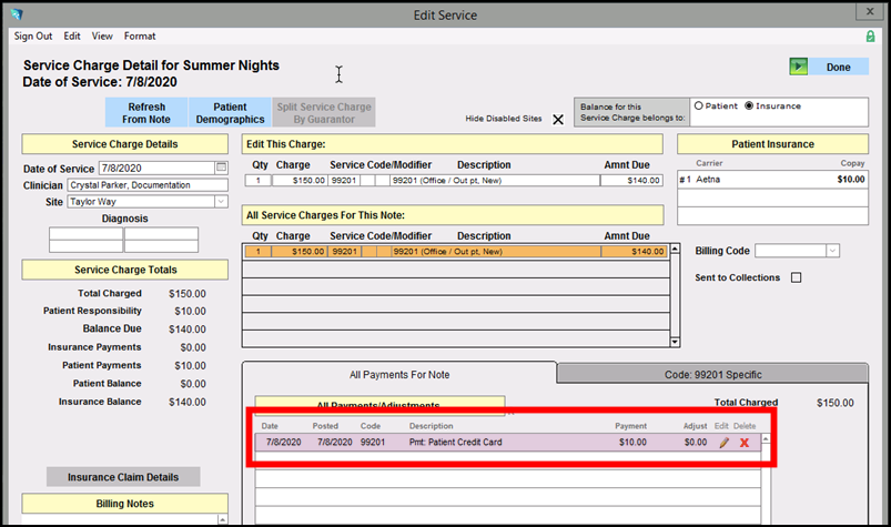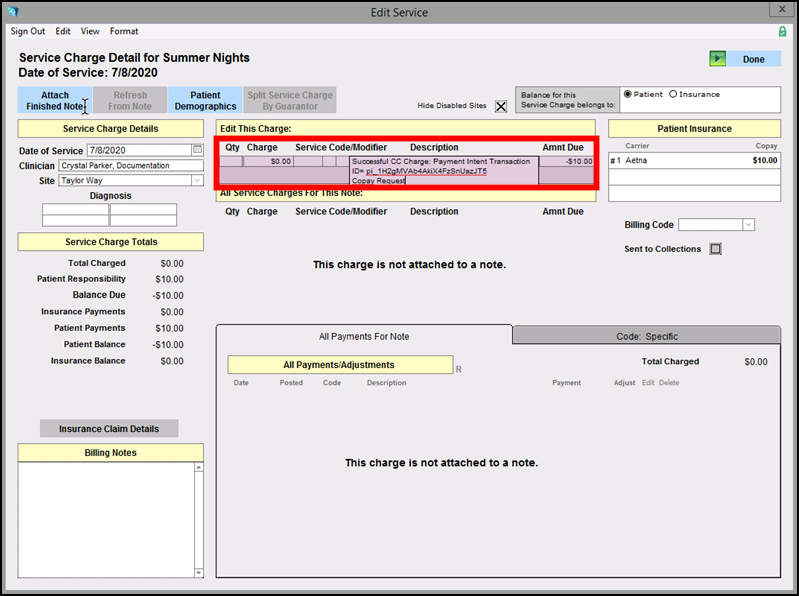 When the copay has been reconciled with the accompanying note, the payment will display under All Payments For Note in the Edit Service window: