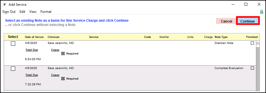 Then on the next prompt to Please verify you want to attach this charge to a note... select Continue, then select the appropriate note for the service.