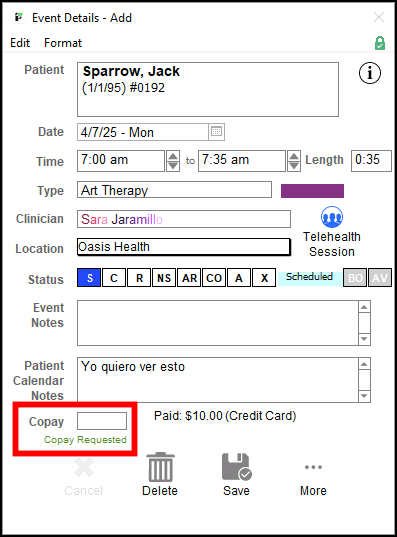 In the meantime, the Event Details window will update to reflect "Copay Requested".