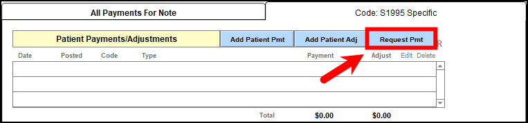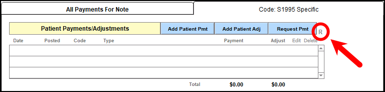 Meanwhile, as you await payment from the client, you can view payment requests directly from within the Edit Service window in Patient Accounts. Within the Code specific tab, you'll notice the letter R next to the Request Payment button.
