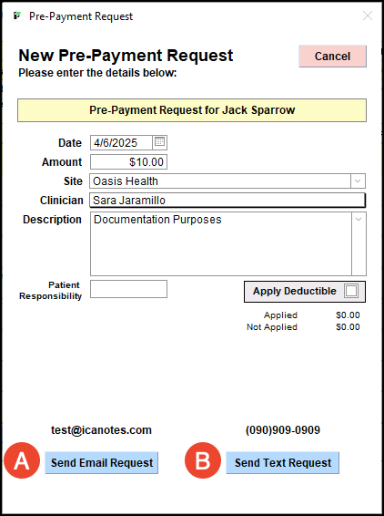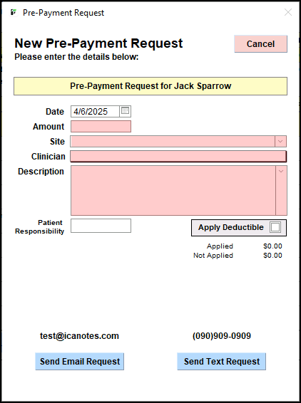 In the New Pre-Payment Request window, fill in all applicable details for the payment request, including Amount, Site, Clinician and Description. Description is not a required field to send the Payment Request.