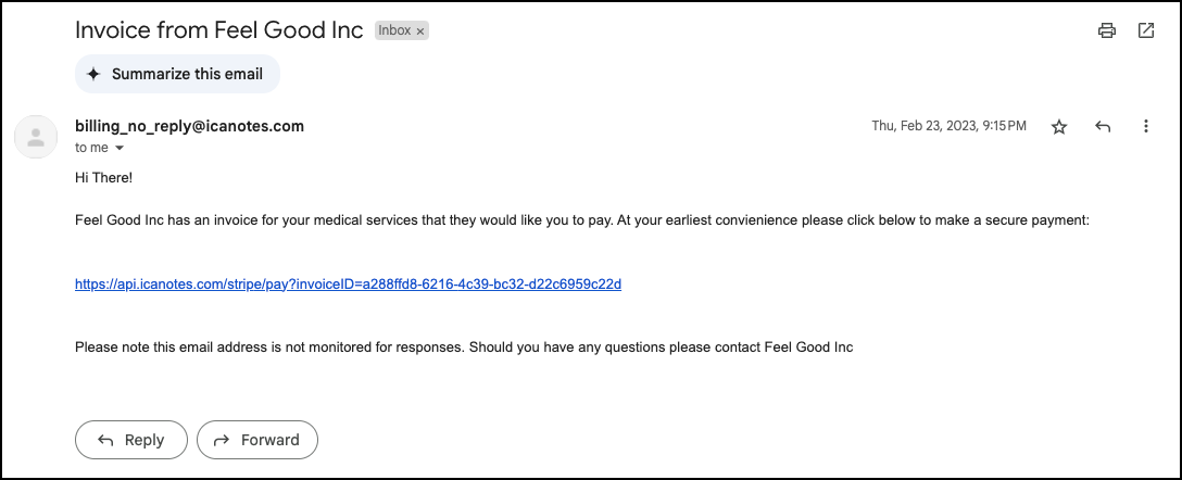 The client will receive the payment request to either their email inbox or mobile phone via text message - depending on your choice. Here is an example of the email payment request: