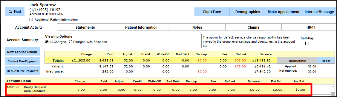 The request will likewise reflect within Patient Accounts via a single line item denoting Copay Request.