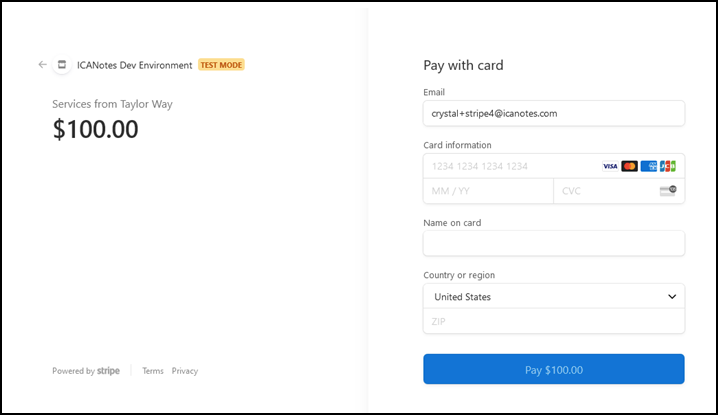 On the secure Stripe site, the client will complete their billing details, including Card information, Name on card, Country/region and Zip. The Email field will pre-populate if 'Send Email Request' was chosen from Patient Accounts. The amount being requested will be listed on the left-side of the screen, as well as the name of the facility; this will be set based on the Site location assigned to the note/service charge within Patient Accounts.