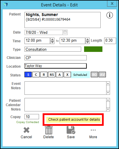 In the Calendar, Event Details for the appointment will now reflect that the copay was collected and to Check Patient Accounts for details.