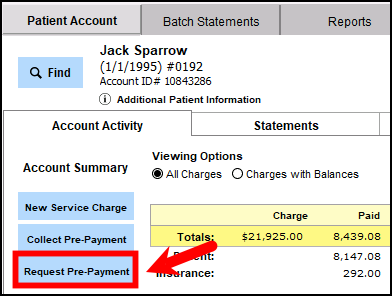 To request a pre-payment in Patient Accounts, start by clicking to Request Pre-Payment.