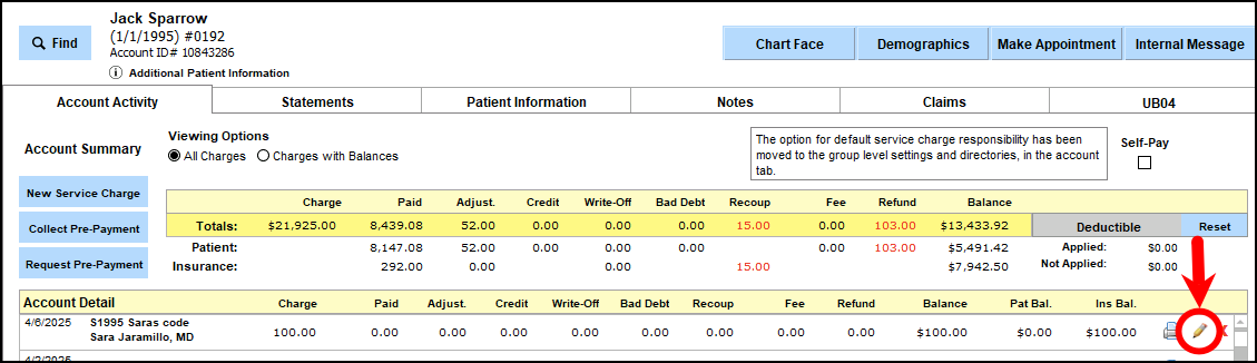 To request payment on a service that exists in Patient Accounts, start by clicking the pencil icon on the appropriate line item.