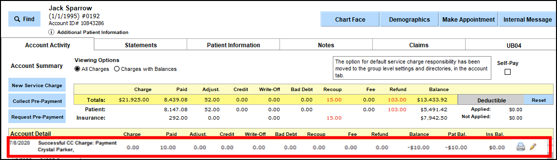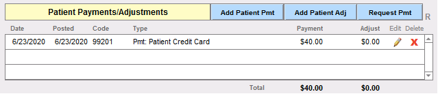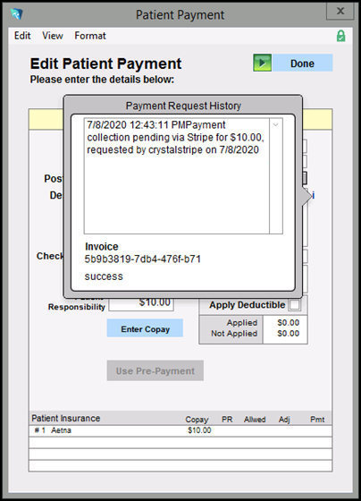 Back in ICANotes Patient Accounts, the line item for the Copay Request will update to reflect successful processing of the payment.
