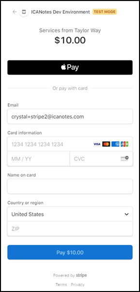 The client will click/tap the link contained in the request to proceed with payment. On the secure Stripe site, the client will complete their billing details, including Card information, Name on card, Country/region and Zip. The Email field will pre-populate if 'Send Email Request' was chosen from Patient Accounts. The amount being requested will be listed on the left-side of the screen, as well as the name of the facility; this will be set based on the Site location assigned to the note/service charge within Patient Accounts.
