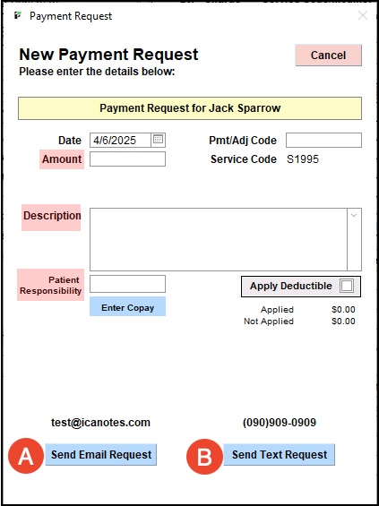 In the Payment Request pop-up, fill in the Amount and Description, as well as any additional information such as Payment/Adjustment code and Patient Responsibility, as needed. You can also use the Enter Copay button if needed (and if a copay is set in Demographics). Description is not a required field to send the Payment Request.