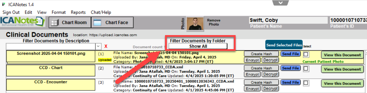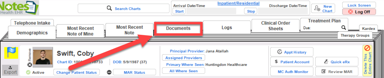 tab found at the top of the patient’s Chart Face. When notes are compiled in ICANotes, they are automatically converted to PDFs at midnight that same day. Clicking the Documents tab allows you to view any notes created in ICANotes that have been converted to PDF, as well as any documents that have been uploaded to that patient’s chart. Like the main Chart Face, the Documents tab also has a filter, which will enable you to narrow your search: