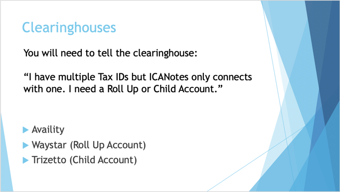 If you are presented with multiple Tax IDs, you will need to contact the clearinghouse. Explain that you have multiple tax IDs but ICANotes can only connect using one. You need a roll up or child account. All of the work occurs on the clearinghouse side – not within ICANotes. Use ICANotes as you would for electronic billing.
