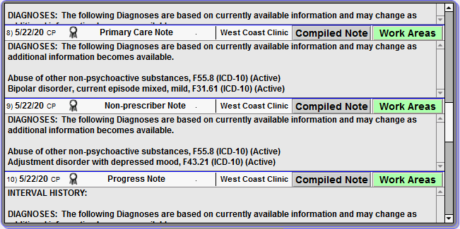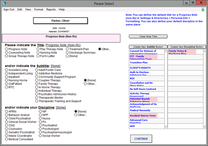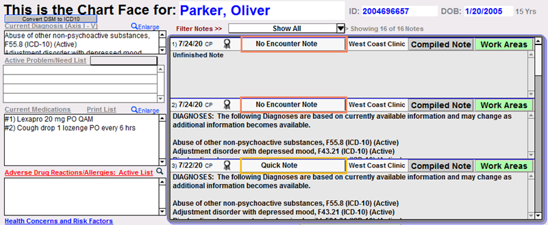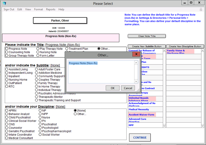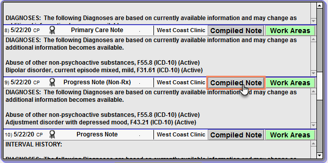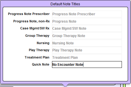 Note: Progress Note titles will still display as their default name within each patient's Chart Face (for note creation) and the work areas of the note. However, the custom note title will display within the finished note, itemized note listing within the Chart Face (both compiled and uncompiled), and within the various reports.