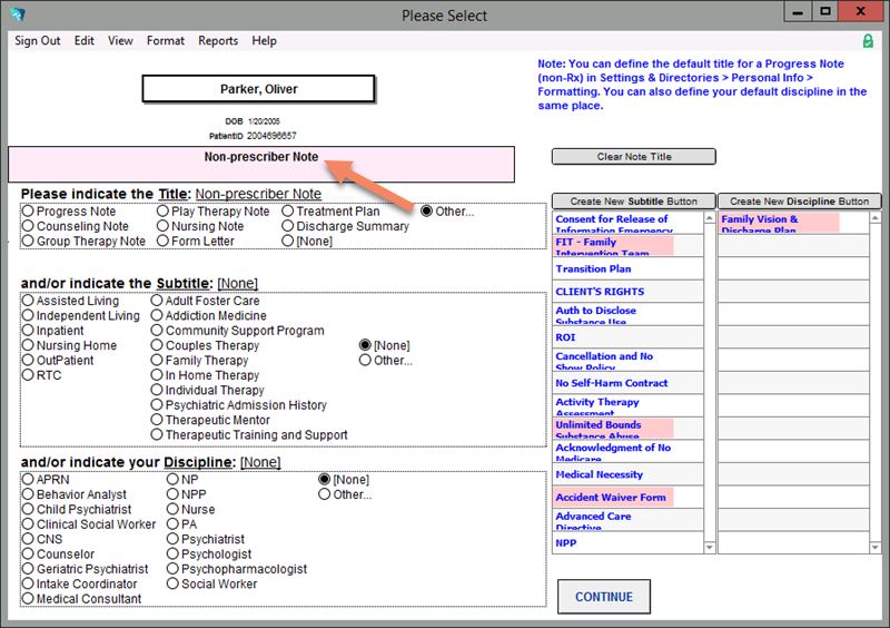 The custom title will automatically display within the header preview. Follow these same steps to make additional changes to the Subtitle and Discipline - or use a Custom Subtitle Button or Custom Discipline Button - if needed, then click Continue to return to the Finished Note screen.