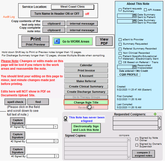 From the Chart Face, click to go to the Compiled Note of that you wish to change the title of (or for just-compiled notes, remain on the Finished Note screen).