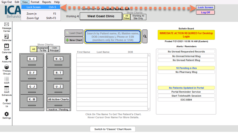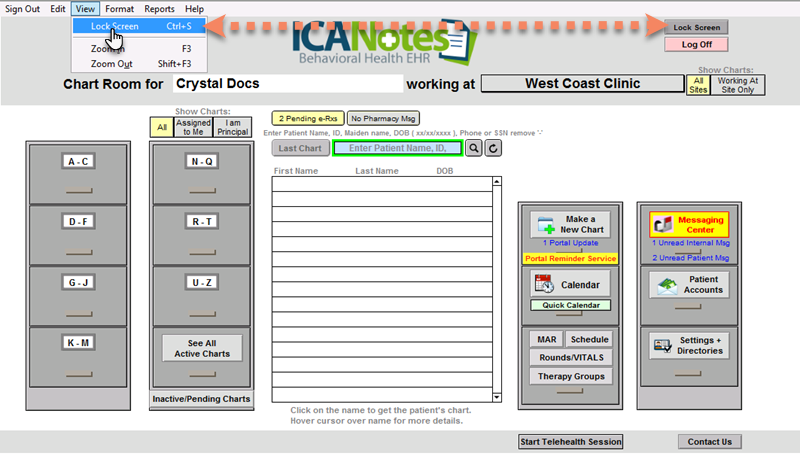 If you need to step away from your workstation and want to lock the ICANotes Screen, you may easily do that now from any place in ICANotes, using the View Menu, Lock Screen command. On your return, enter your ICANotes password and log back in.