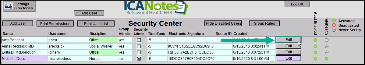 5. In the Security Center, find the name of the person who will take the role of Patient Portal Admin and click the 'Edit' button in the right column.