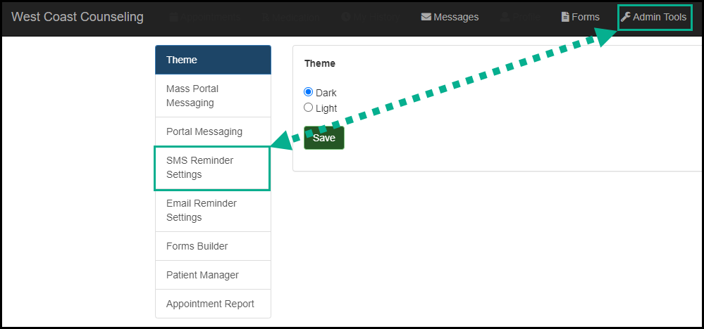 1. If you have text reminders activated, there will be a selection available for Patient Portal Administrators under the 'Admin Tools' tab in the Patient Portal.