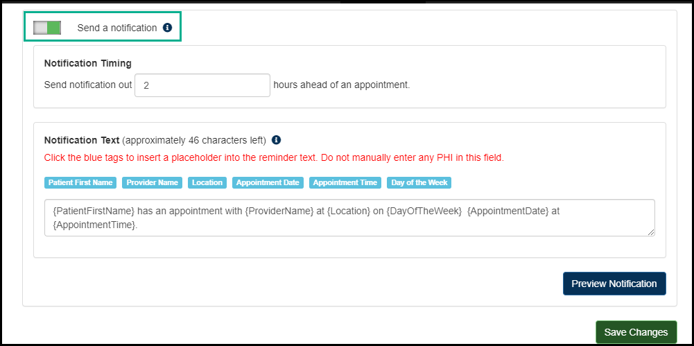 7. Set up a Notification. The most notable difference is that there is not an option to allow a patient to Confirm/Cancel with the Notification.