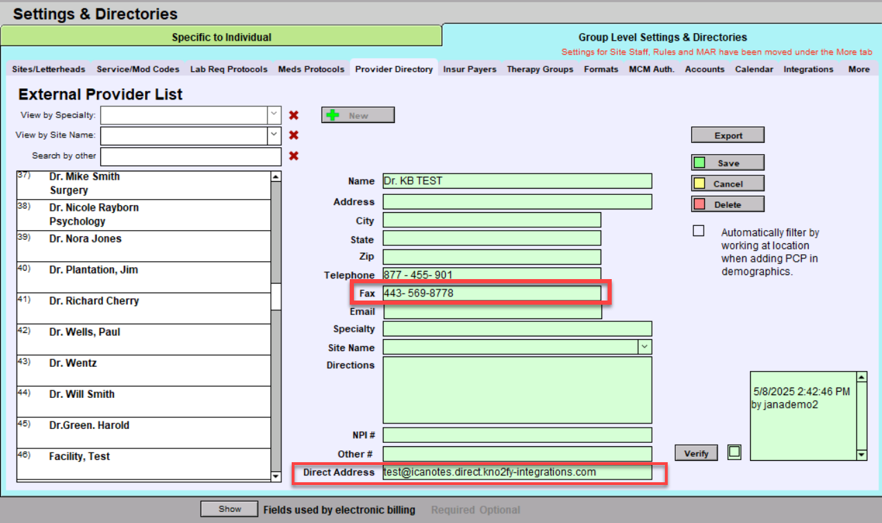 4. Create a new user or edit an existing one. Add the Direct Address and/or Fax (if you have fax enabled for Kno2).