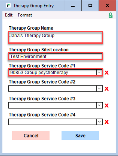 Assign the group a Therapy Group Name, Site/Location, and up to four service codes. Then click the 'Save' button to save.