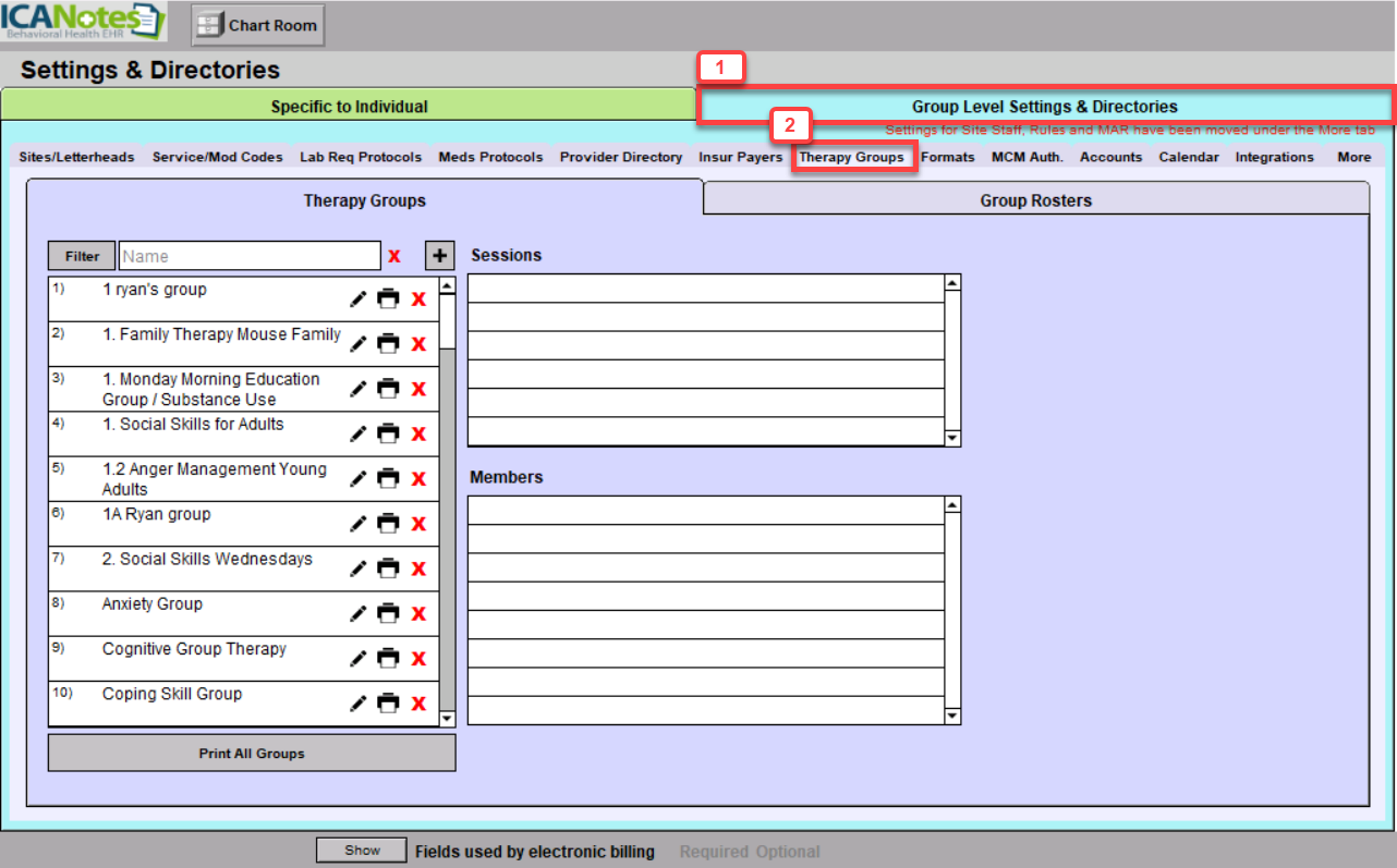 - Click on the Therapy Groups tab. The Therapy Groups tab has two additional tabs on it – Therapy Groups and Group Rosters.