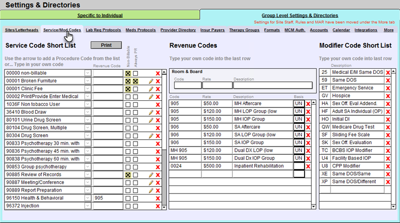 In Group Level Settings & Directories, click into the Service/Mod Codes tab.