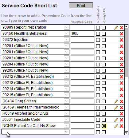 To the left in the Service Code Short List, use the next available line to select or enter a service code.