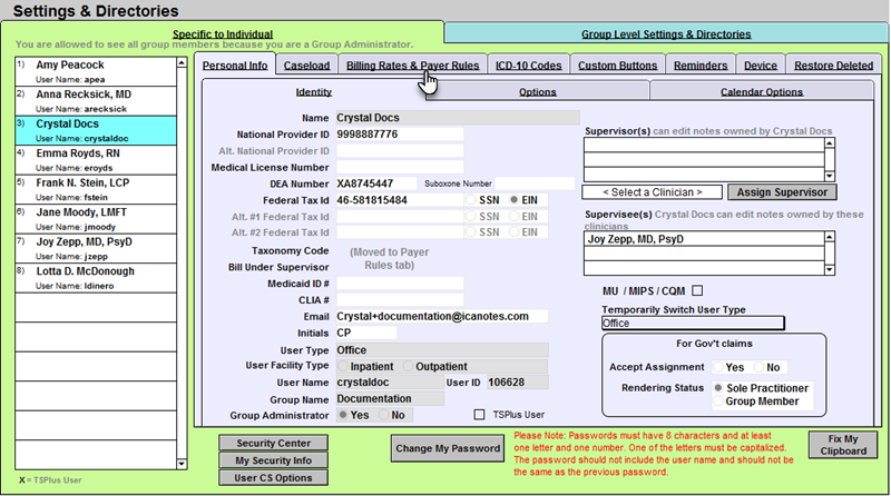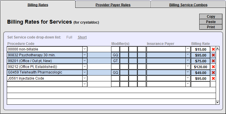Use the Copy and Paste buttons to apply the billing rates to multiple user accounts. Or, if billing rates and/or payers will differ between clinicians, follow the steps outlined above to build additional rules for other users.