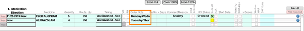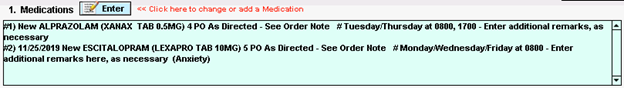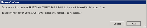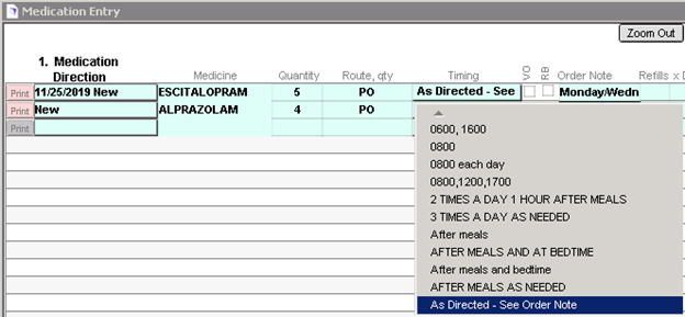 Continue order any medications as necessary, using the As Directed – See Order Note timing option to utilize the custom settings as needed. The timing specification, as well as any remarks, if entered, will be visible within the medication work areas…