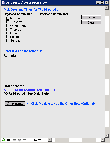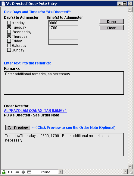 For example, this medication order is set to administer Tuesday and Thursday at 0800 and 1700 hours. Additional remarks, if entered, will be included within the text of the medication order. Click the Preview button to see what the timing of the order will look like: