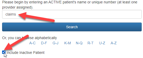 6. Type "Claims" in the patient name search box. You may have to select the "Include Inactive Patient" box.