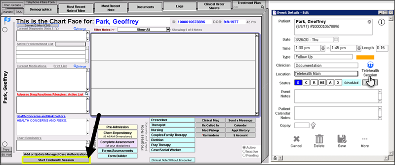 Detail: Start Telehealth Session from multiple points in ICANotes: Chart Room, Chart Face, Event Details